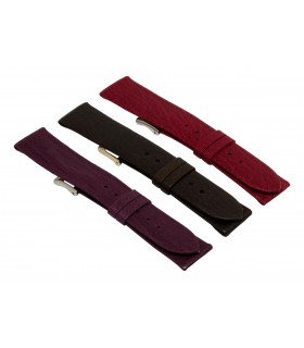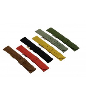 Correa de piel de cabra sin costura con acabado vuelto y corte plano. Disponible en nueve colores, tres medidas (de 16 a 20 mm) y dos cierres de hebilla (plateado y dorado)