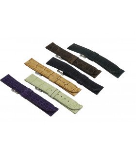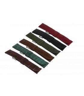Correa de piel vacuno con grabado cocodrilo y alomada. Disponible en cuatro colores, cuatro medidas (de 18 a 24 mm) y dos tipos de cierre de hebilla (plateado y dorado)